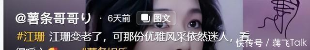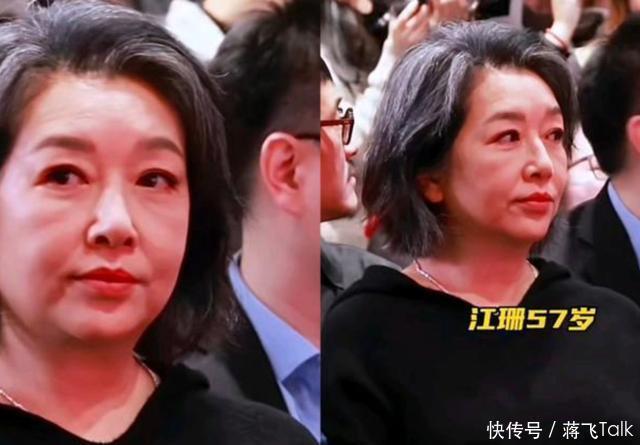 不知道是不是角度问题,江珊的嘴似乎有些歪斜,脸也比之前垮了太多,法令纹不是一般的重,并且比年轻时候发福了不少,眼睛都有点“肿眼泡”那味儿了。